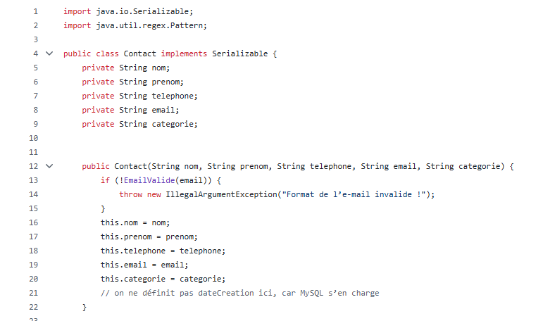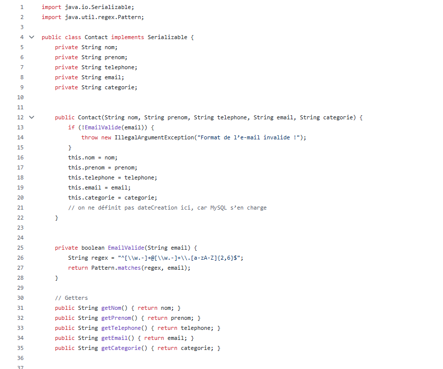 Ma contribution majeure s'est concentrée sur la classe GestionnaireContacts. J'ai architecturé les méthodes de connexion, la validation d'unicité des emails et la sécurisation des requêtes de suppression et de recherche.